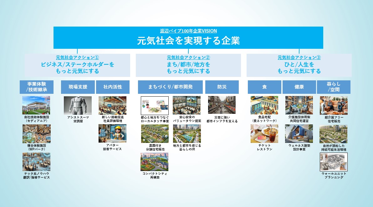 数年先を見据える中期経営計画とは異なり、100年企業VISIONは“創業100周年とその先”を見据えた未来図です。